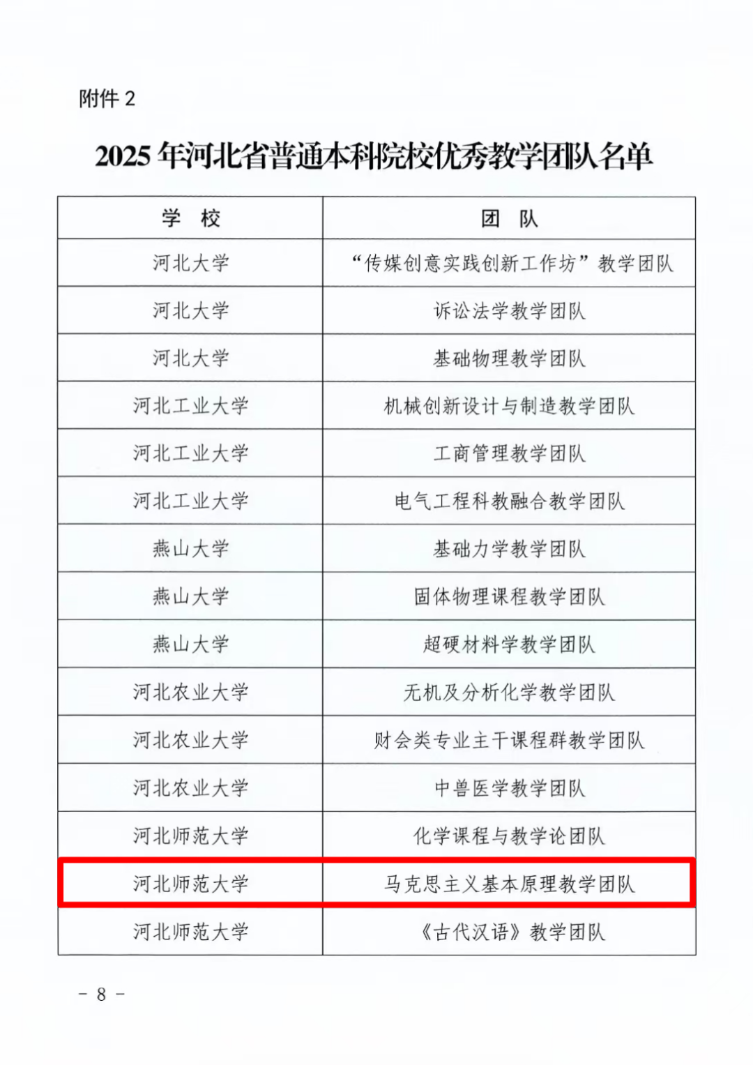近日,河北省教育厅公布了2025年河北省普通本科院校教学名师和优秀教学团队名单,经严格评审,全省共确定教学名师89名、优秀教学团队83个。我院马克思基本原理教学团队凭借卓越的教学水平和育人成效,成功入选省级荣誉榜单。